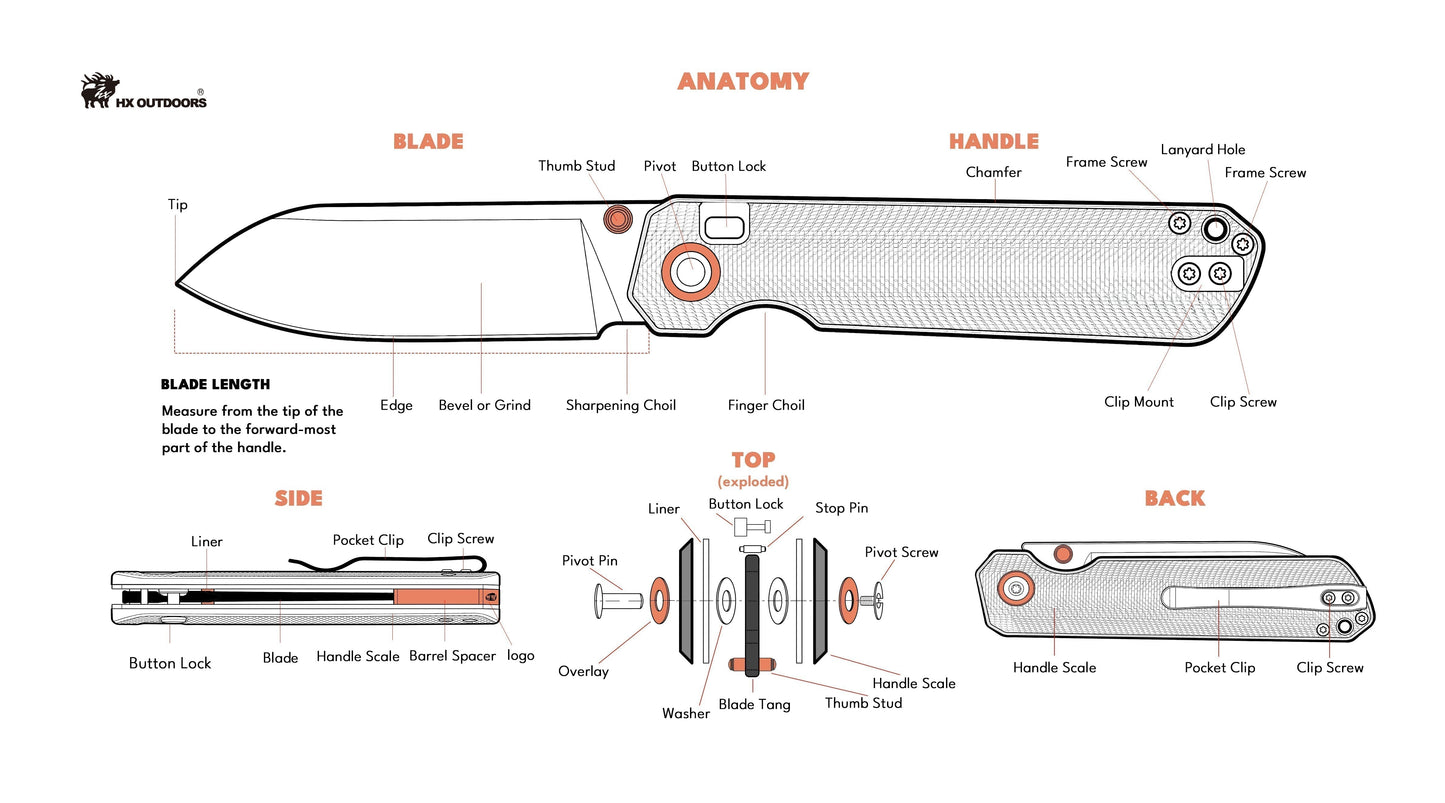 Explore the essential anatomy of a pocket knife, including the blade tip, thumb stud, pivot, lock, handle scales, pocket clip, and all internal parts. Learn how each component—from sharpening choil to stop pin—works together for function, safety, and optimal knife performance.