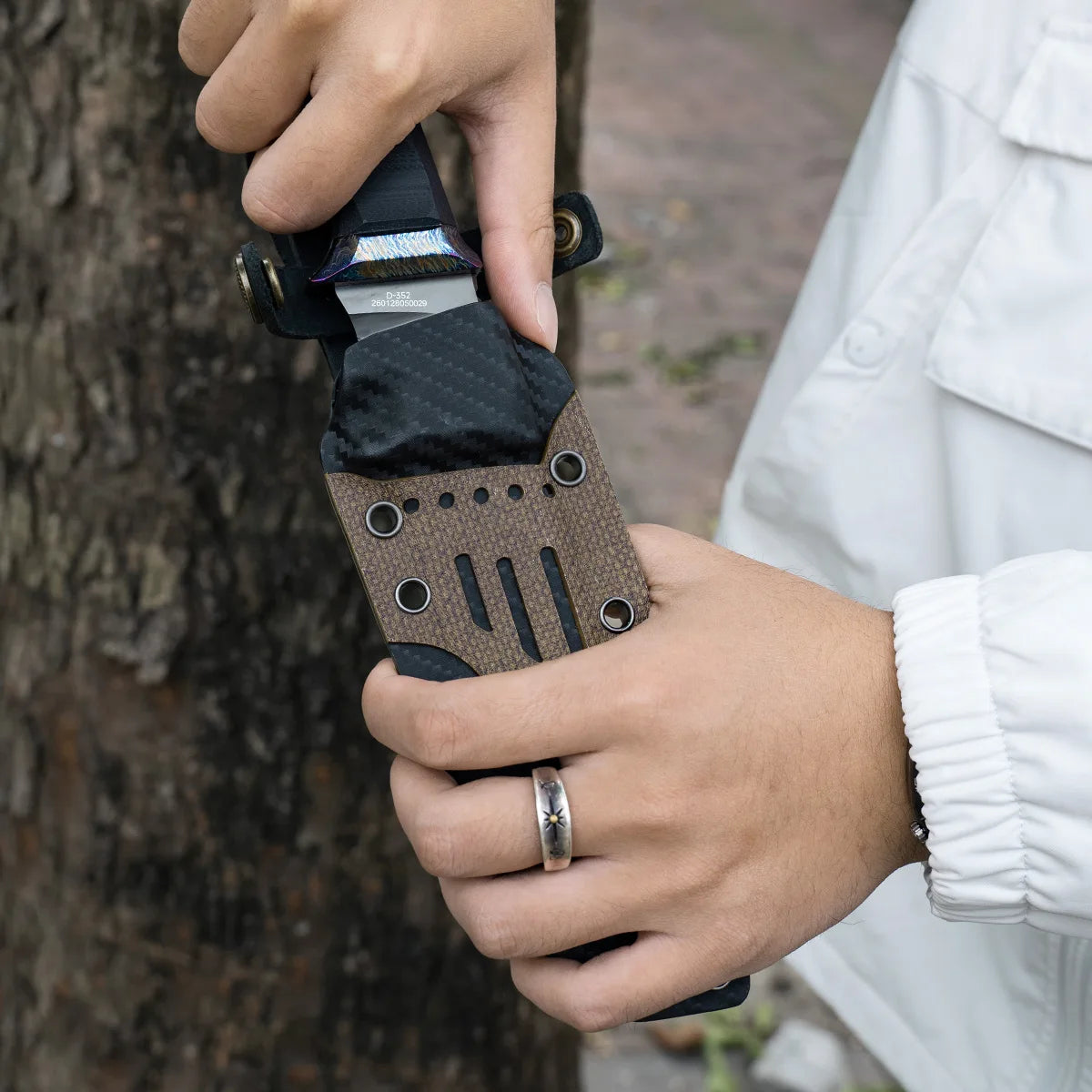 This is a tactical fixed blade from the Prism series, integrating cutting-edge material technology and precision craftsmanship. The blade is forged from high-performance powdered metallurgy steel, treated with vacuum and deep cryogenic processes to achieve an exceptional balance of hardness and toughness. It is coated with a deep, wear-resistant DLC (Diamond-Like Carbon) finish, ensuring outstanding corrosion resistance and low visibility even under extreme conditions.