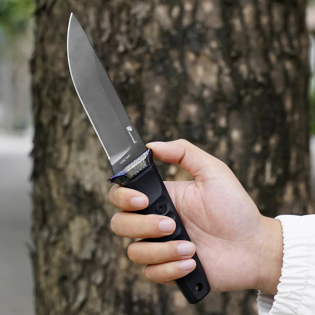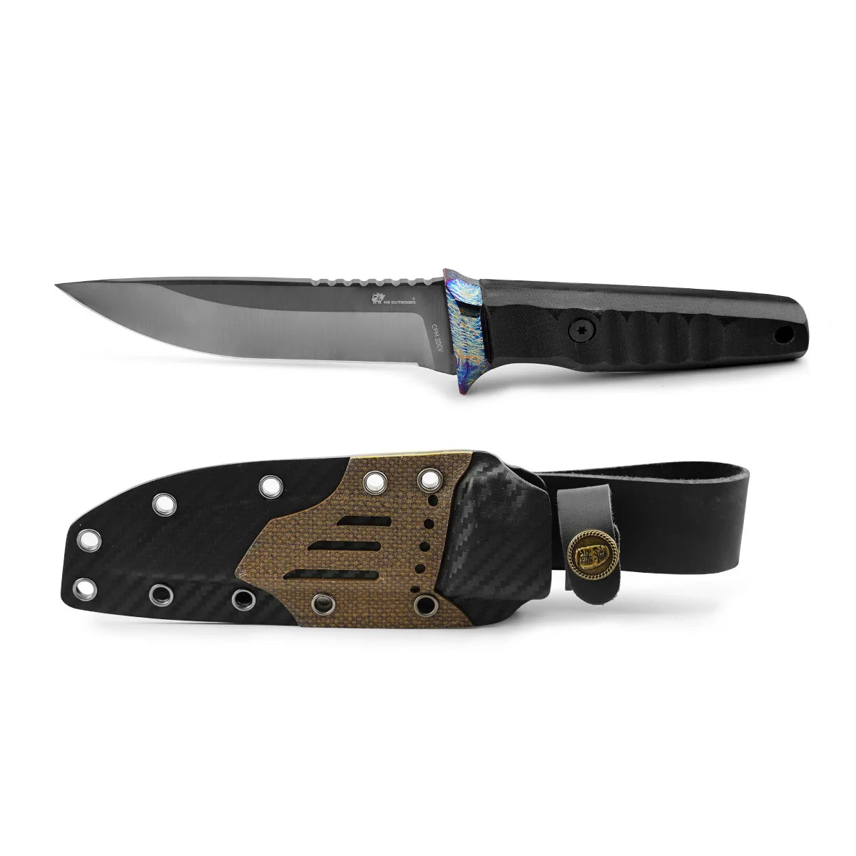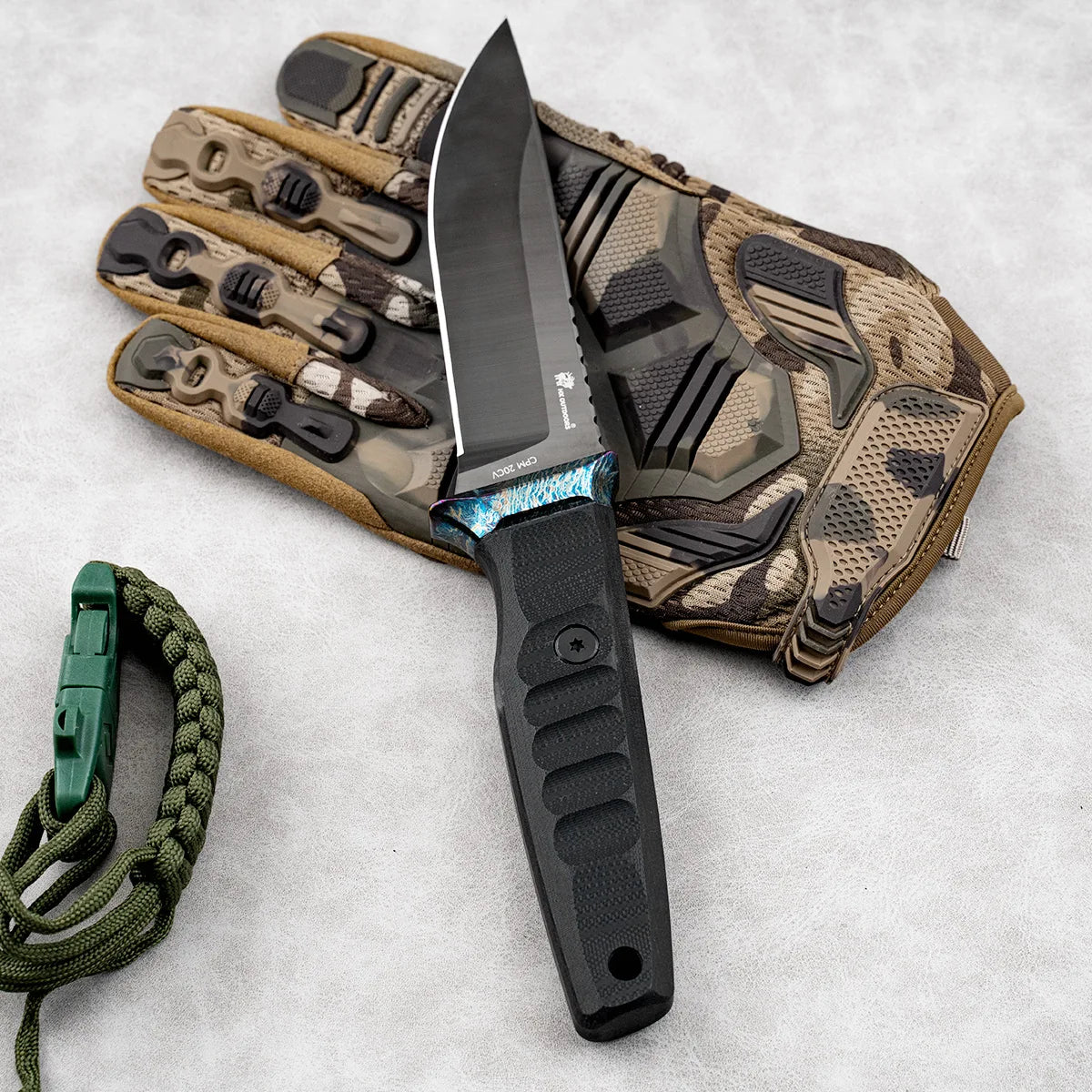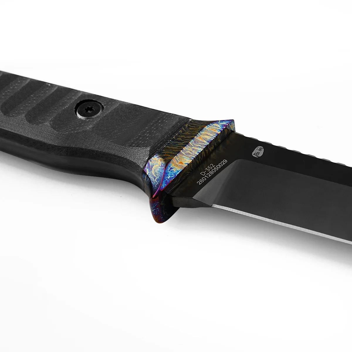 The handle is built on a full-tang, one-piece structure and wrapped in classic black G10 composite, offering stable, all-weather grip security. The guard is meticulously crafted from TC4 titanium alloy, hand-finished and heat-colored to display a unique gradient sheen, combining lightweight construction with structural strength. Ground with a precise V-edge and professionally sharpened, this knife embodies the ultimate pursuit of performance, aesthetics, and reliability in modern tactical blade design.