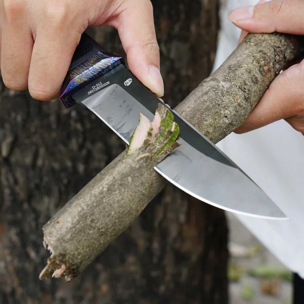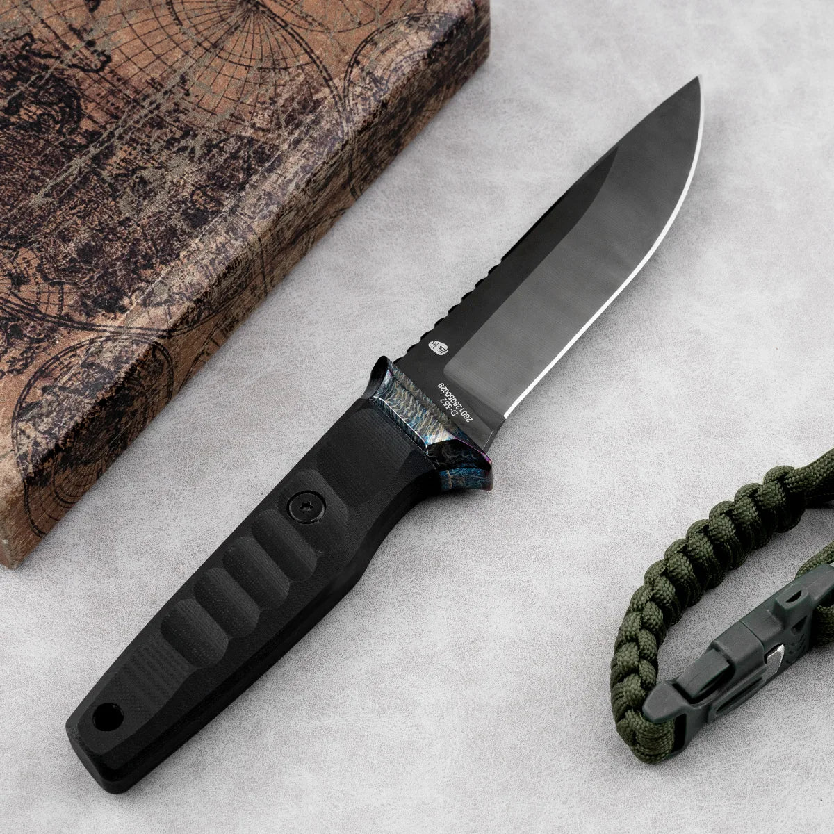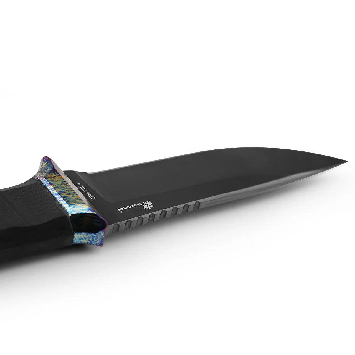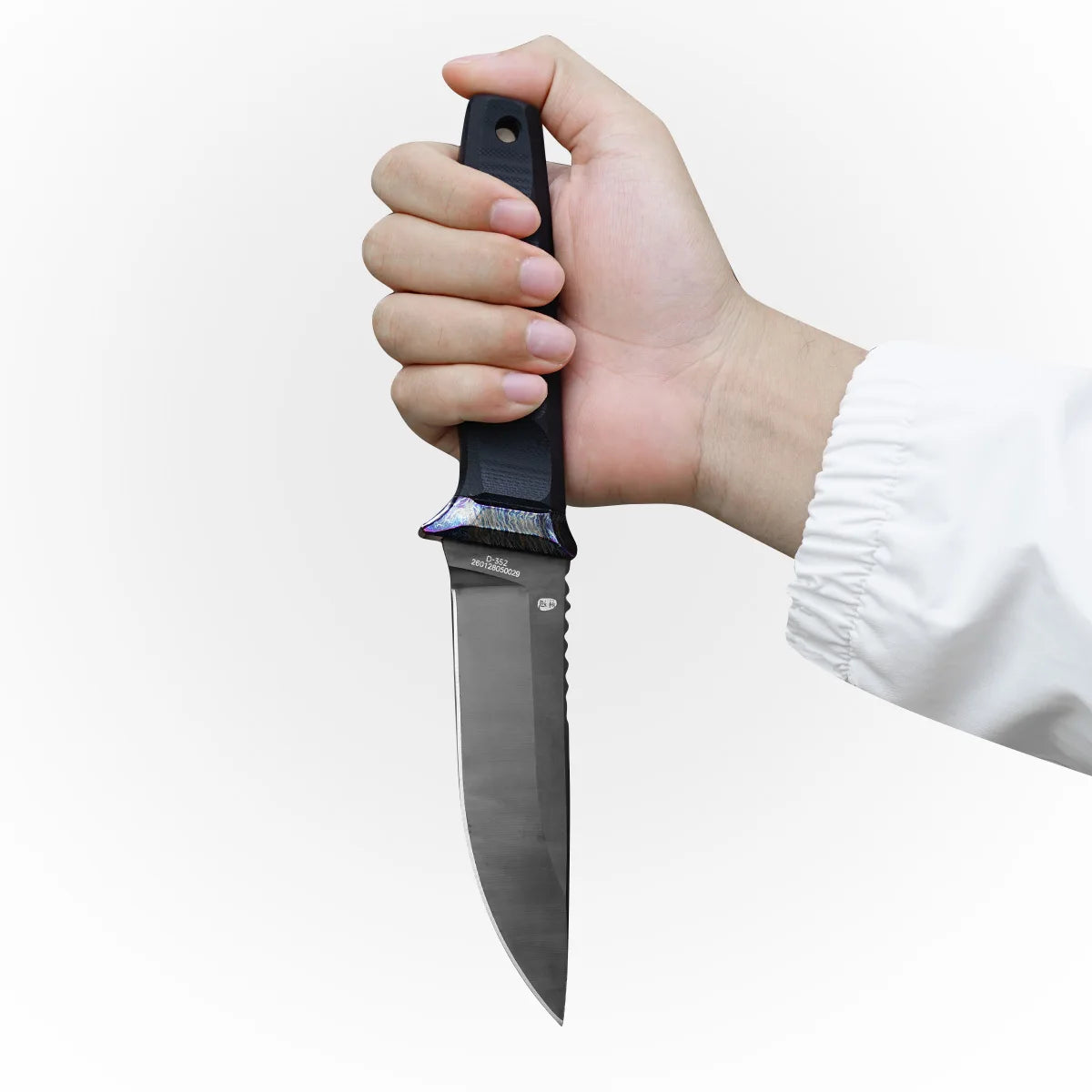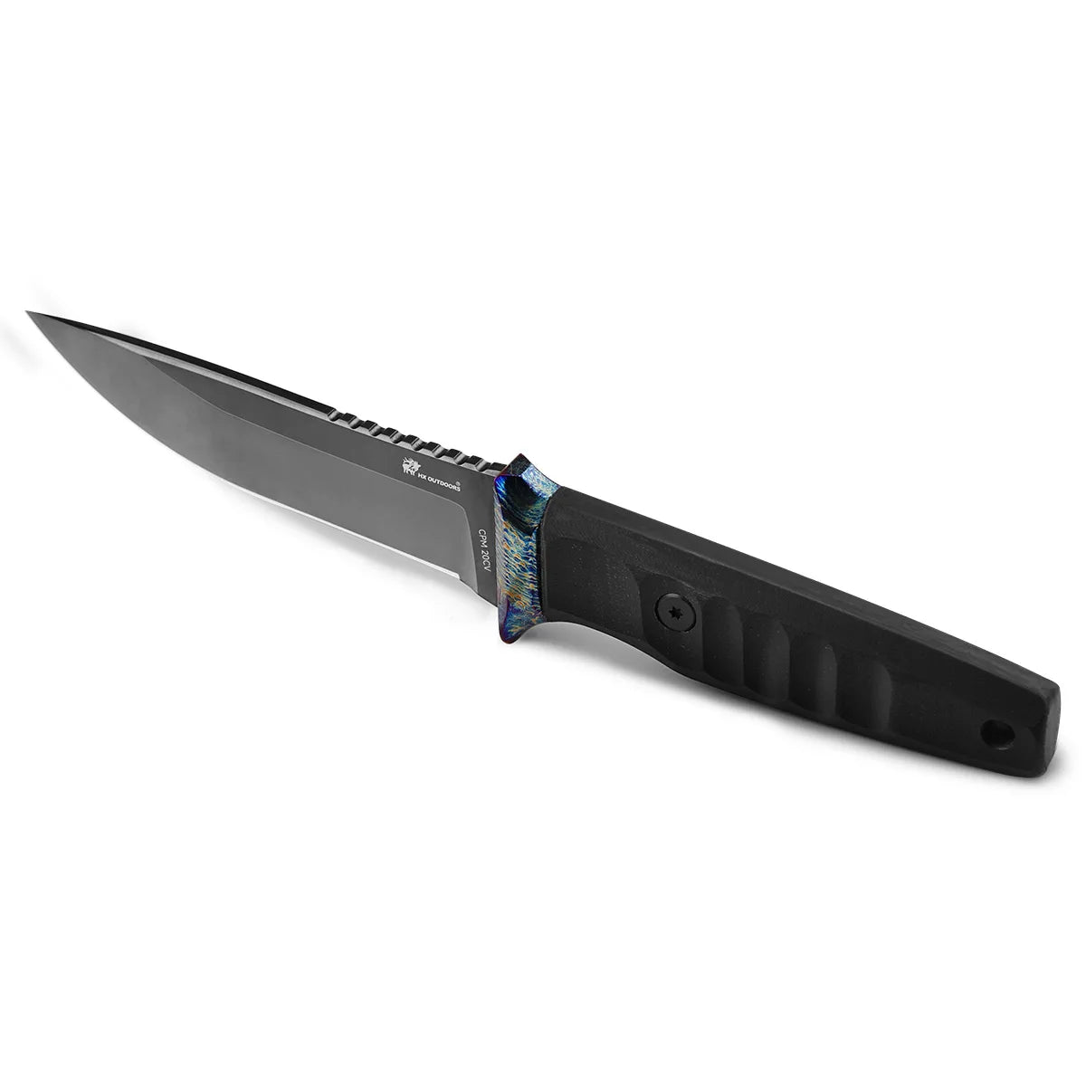 The handle is built on a full-tang, one-piece structure and wrapped in classic black G10 composite, offering stable, all-weather grip security. The guard is meticulously crafted from TC4 titanium alloy, hand-finished and heat-colored to display a unique gradient sheen, combining lightweight construction with structural strength. Ground with a precise V-edge and professionally sharpened, this knife embodies the ultimate pursuit of performance, aesthetics, and reliability in modern tactical blade design.